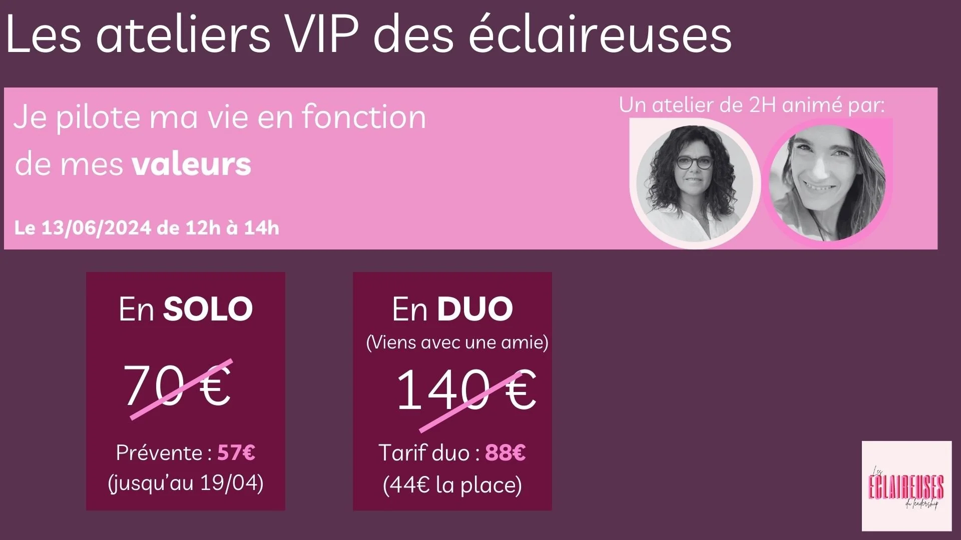 Et si tu veux venir avec une amie on a crée le Pack DUO: Tarif early bird jusqu’au 19/04/2024: 88 € (44€ la place) au lieu de 140€